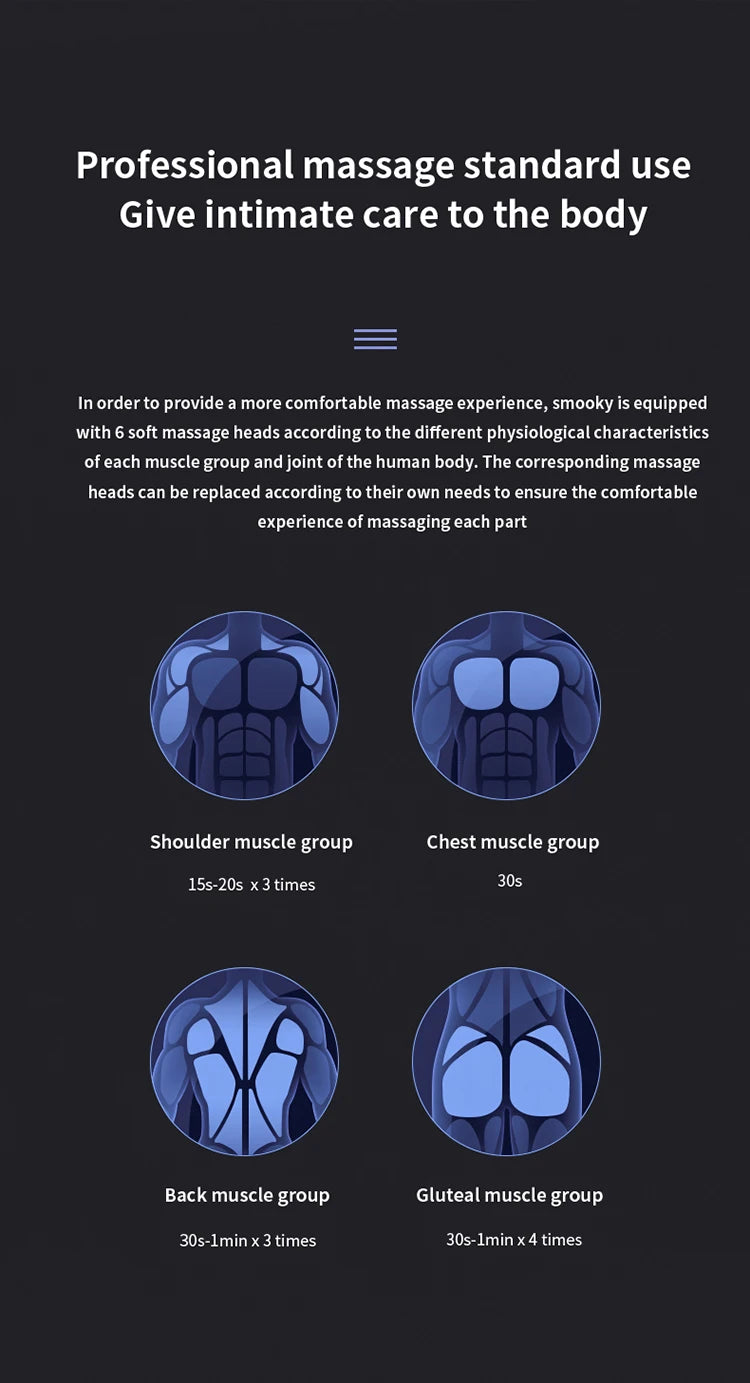 2. 4 interchangeable massage heads: for different body parts and muscle groups to relieve muscle tension in the legs, back, neck and shoulders.