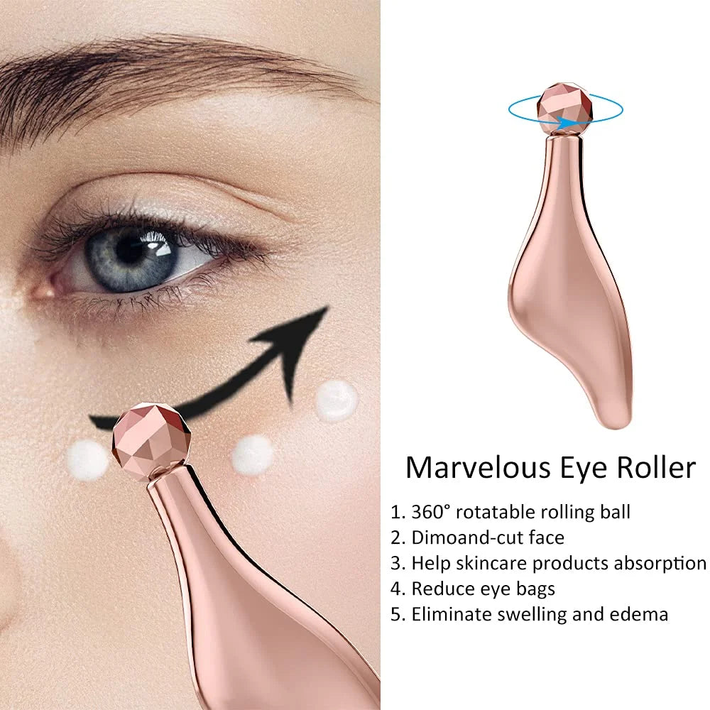 ❤ New Design: The 3D face roller has two rolling balls with 360°rotate design, which has a better effect on your face. There is a rolling ball on the head of the gua sha tool with a diamond-cut surface, which can be used to massage the delicate skin under the eyes and nose, etc.. The metal gua sha tool is also beneficial for pressing acupuncture points.