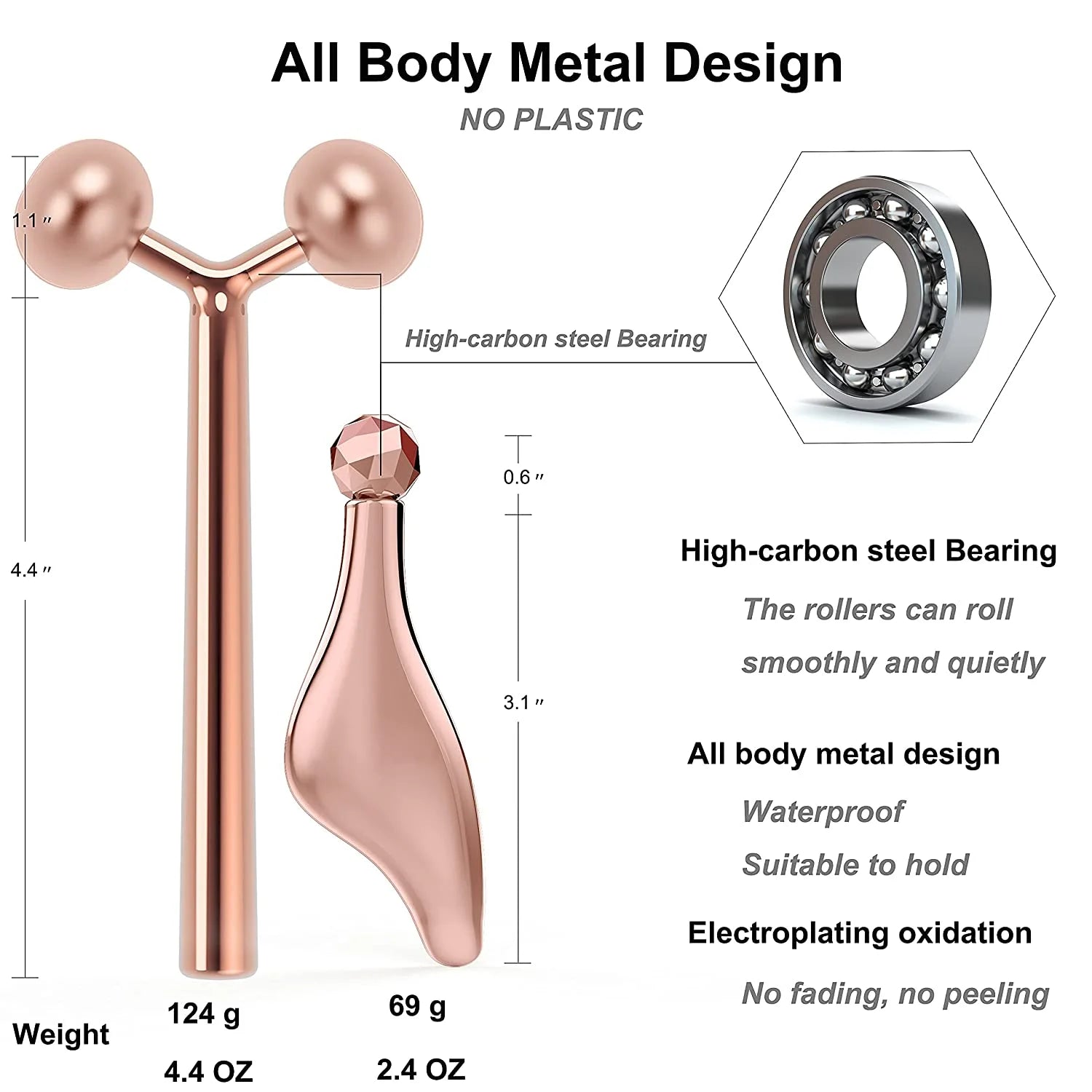 ❤ Metal Material: We have selected pure metal material and rose gold-plated appearance for you to make the face roller look more beautiful. The face roller set is very textured in the hand, and the exquisite polishing gives the face roller a smooth edge. Moreover, the metal material is waterproof, allowing you to massage when taking a bath.